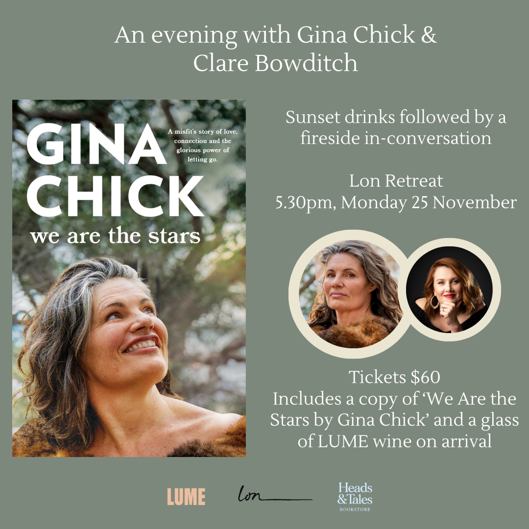 Following our recently sold out event with Heads & Tales, we are excited to welcome back our friends Gina & Clare to Lon for another evening of magic. Come along to an in-conversation event with two extraordinary women – Gina Chick and Clare Bowditch – to celebrate Gina’s debut memoir We Are the Stars.