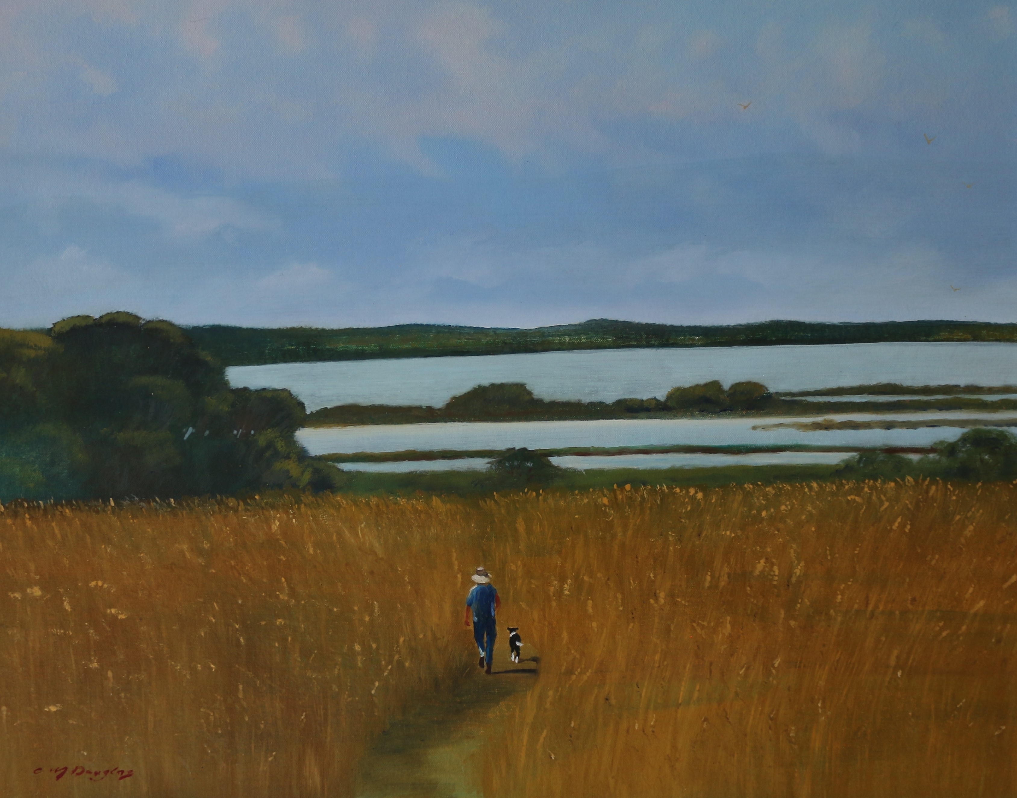 “This exhibition of new paintings of Lon Retreat and surroundings are my expression of this unique area: an oasis almost surrounded by seaside villages, the ruggedness and glare of sand dunes and scrub along the coast, the quiet and stillness of summer pastures. Standing still you see the soft swaying of tall grasses brushed by gentle breezes, and the feeling of an untouched haven surrounded by activity. I have felt this as I wandered around looking and seeking inspiration for this artistic challenge. I believe I found all of this and hope you also see what inspired me in these works.”